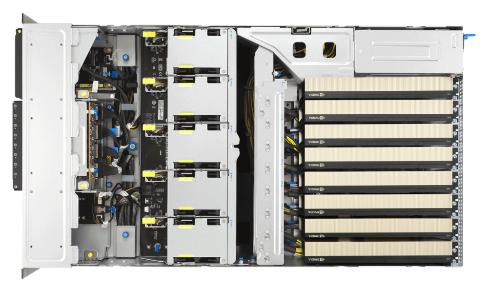 The GPU-optimized design of the AIME A8005P with high airflow cooling allows the use of eight high-end double-slot GPUs like the latest NVIDIA H200 NVL, NVIDIA H100 NVL, RTX Pro 6000 Blackwell, NVIDIA L40S, RTX 6000 Ada, and RTX 5000 Ada GPU models.